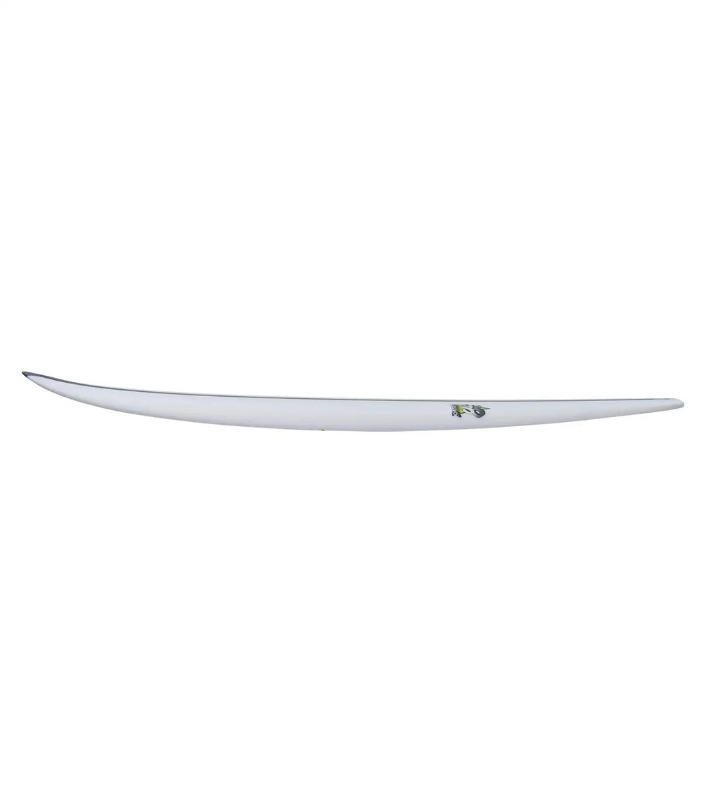 The deck stays flat with a down rail and beak nose. This allows for maximum volume, yet the down rail lets you still sink this higher volume board onto rail in critical sections and off your bottom turns.