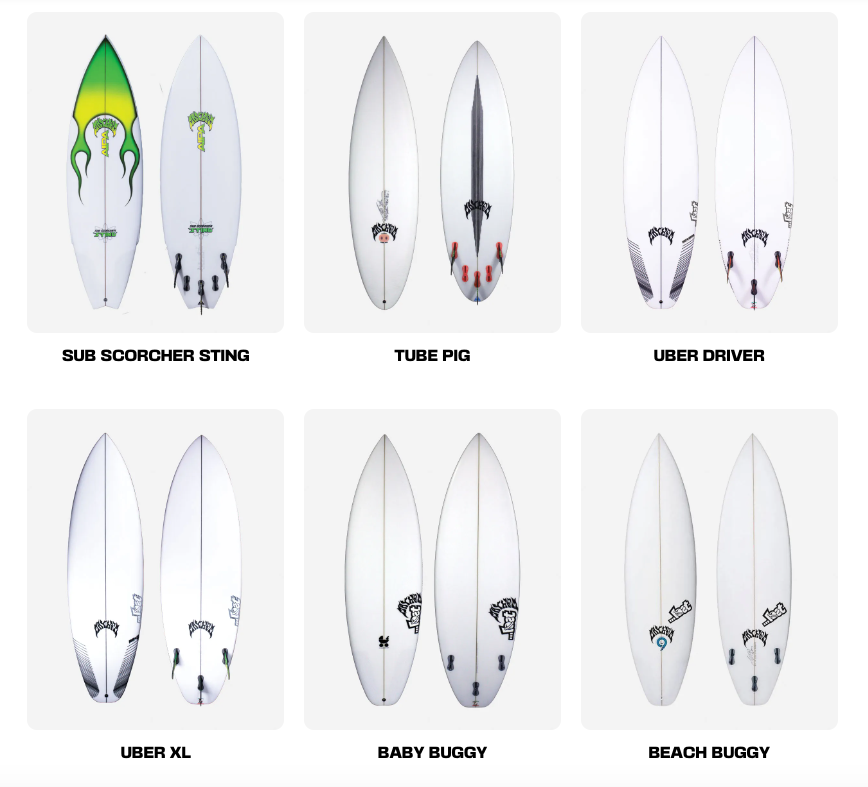 Popular Lost Mayhem models include the V2 rocket, Rocket, Driver 3.0, Sub Driver 3.0, Step Driver, Uber Driver, Stub Driver, Rad Zapper, The Ripper, and Formula One (F1). Other favorites are the Puddle Jumper, Puddle Jumper Pro, Puddle Jumper Sting, Hydra, Quiver Killer, Party Platter, Party Crasher, RNF 96 (Round Nose Fish), RNF 96 Kingfish, Pisces, Retro Tripper, Round Nose Fish Retro, California Mid, California Twin, Twin Pin, Mod Quad, Big Rig Driver, LayZToy II, Rocket Redux, Smooth Operator, Pocket Rocket, and Sub Buggy, with many more options available.