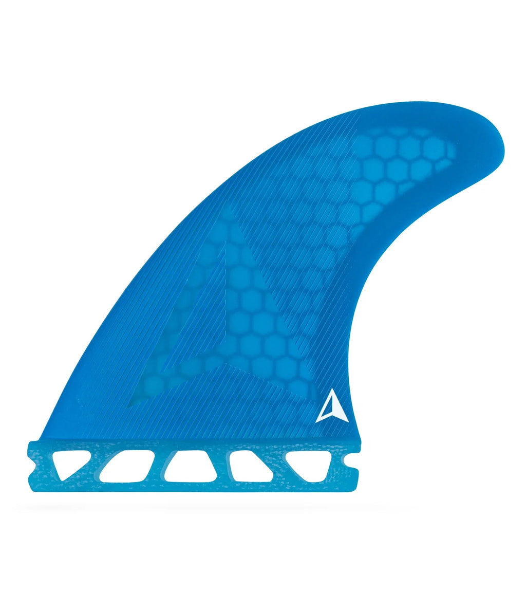 This is the go to fin for most boards in almost any waves. It has a fairly upright shape, with a wide base and medium wide tip. It feels predictable, powerful and forgiving – able to generate speed and drive through turns but release for manoeuvres and direction changes. This makes it especially good when the conditions are less than perfect. Its versatility also makes it an ideal front fin set in either Thruster or Quad.