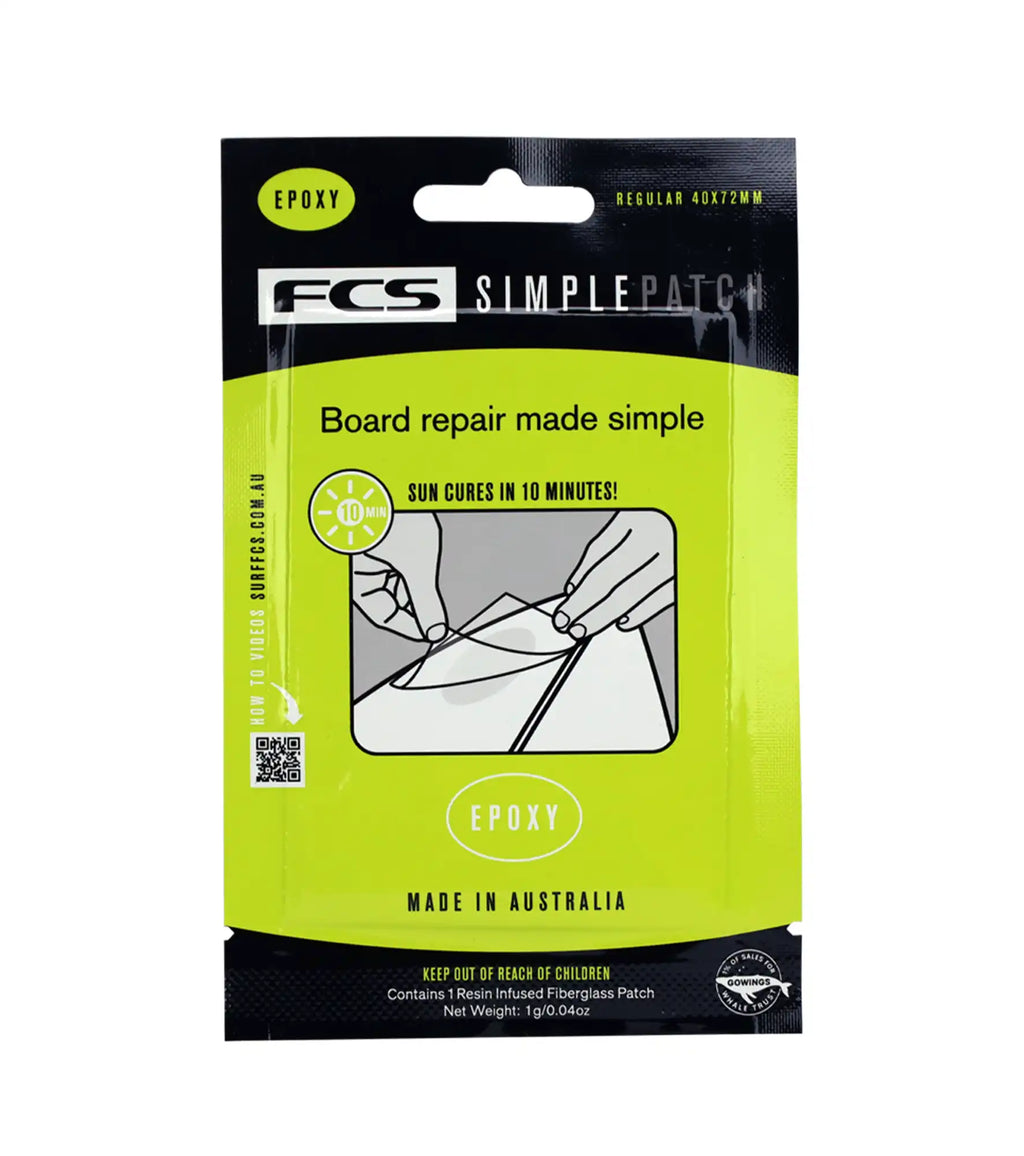 FCS Simple Patch is a revolutionary resin infused 3oz fibreglass patch that can be easily applied to create a smooth finished, waterproof, high strength permanent repair in minutes. No more mixing resins, no more sticky fingers, no more endless sanding to get smooth, just simply Peel & Stick!