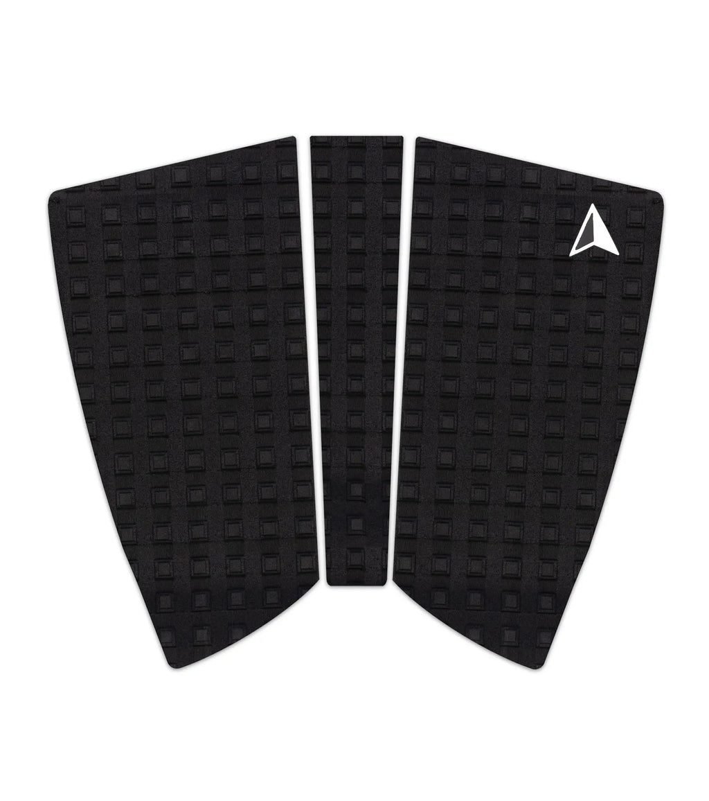 The 2+1 is our super versatile Fish pad. The shape suits any Fish with a deep swallow tail – use it as a 2 piece pad for a medium wide tailed fish, or use the wedge centre piece in either 180o position for a wide or extra wide tail. The pad is flat with no arch, our lowest kick tail and square grooving designed for easy movement and repositioning of the back foot for front foot fish surfing, but plenty of grip when you lean into a turn and push hard through the tail.